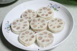 3. 裹面糊:将藕片平铺在案板上,将肉馅放在藕片上,然后将另一片藕片盖在上面,用筷子轻轻压实。